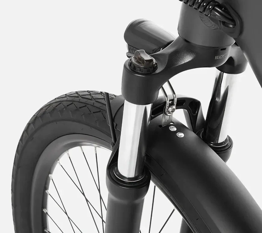 Powered by a 350 W motor and a 36 V 10 Ah lithium ion battery, the DYU C1 offers a top speed of 25 km/h (15.5 mph), up to 65 km / 40 mi in assist mode, and up to 43 km / 27 mi in throttle mode. Front shock absorption helps add comfort on uneven streets and rougher urban surfaces.