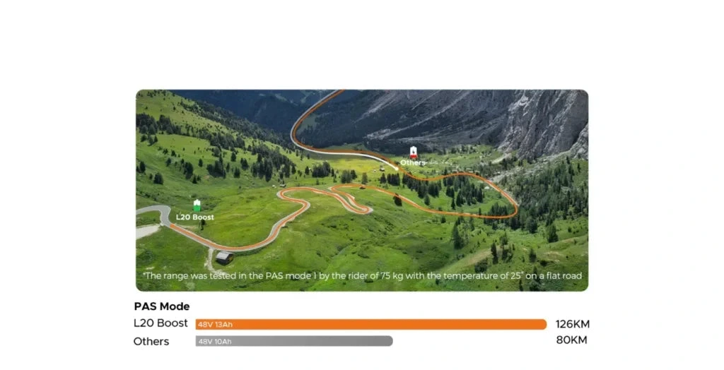 | Max Mileage | 126 km (actual distance depends on rider weight and road) |