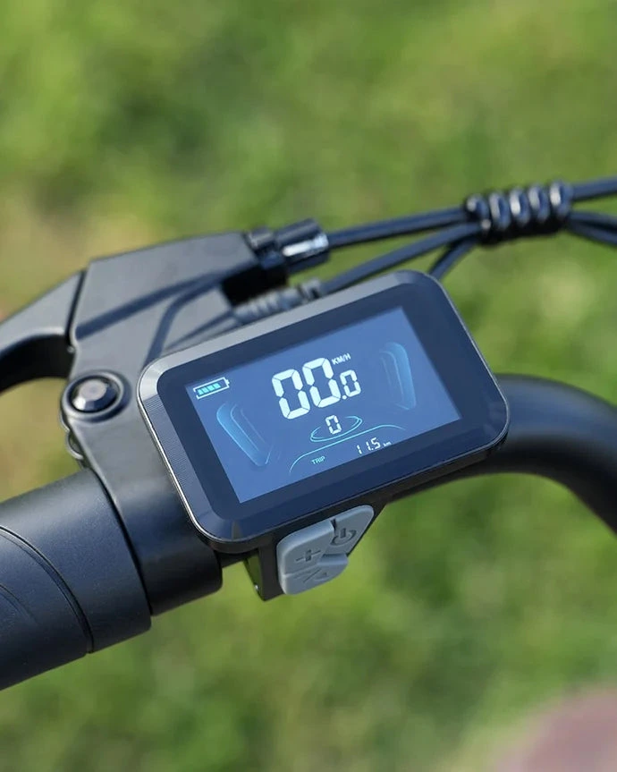 - LCD display showing speed, battery level, trip distance and pedal-assist mode