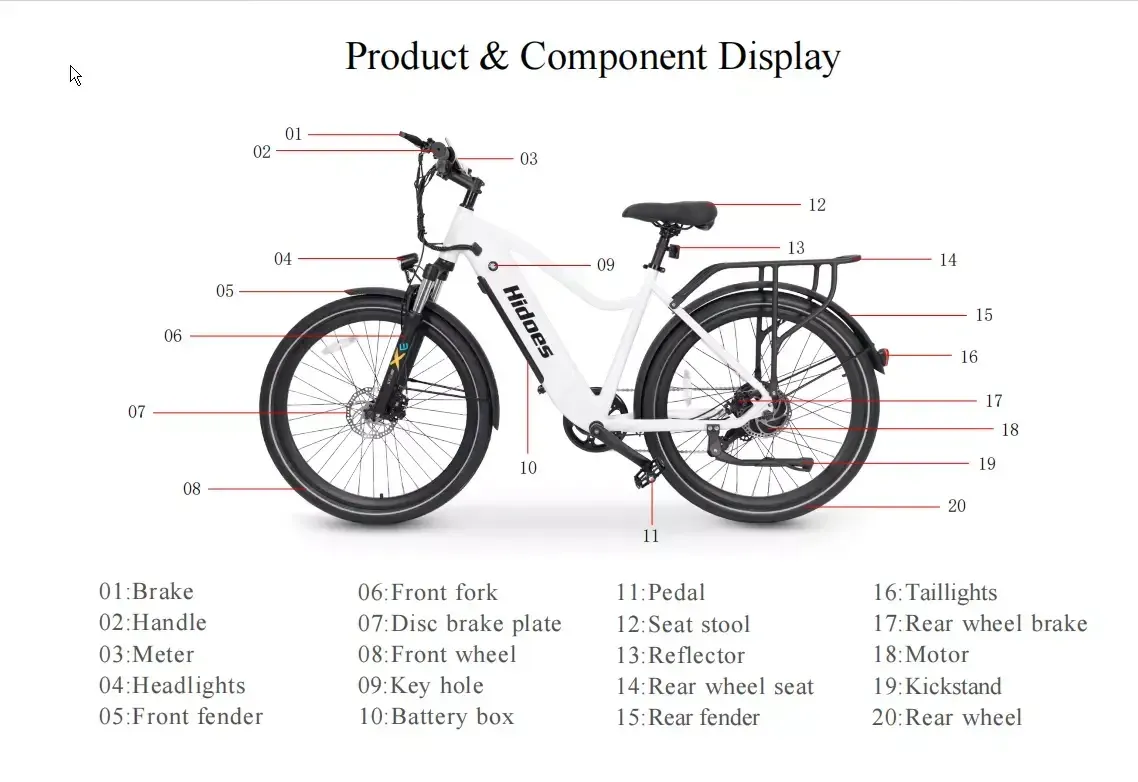 Safety is paramount with the Hidoes BN1. The bike is equipped with front and rear power/mechanical disc brakes, offering reliable stopping power in all conditions. The brake off power feature ensures the motor stops when brakes are applied, enhancing safety.