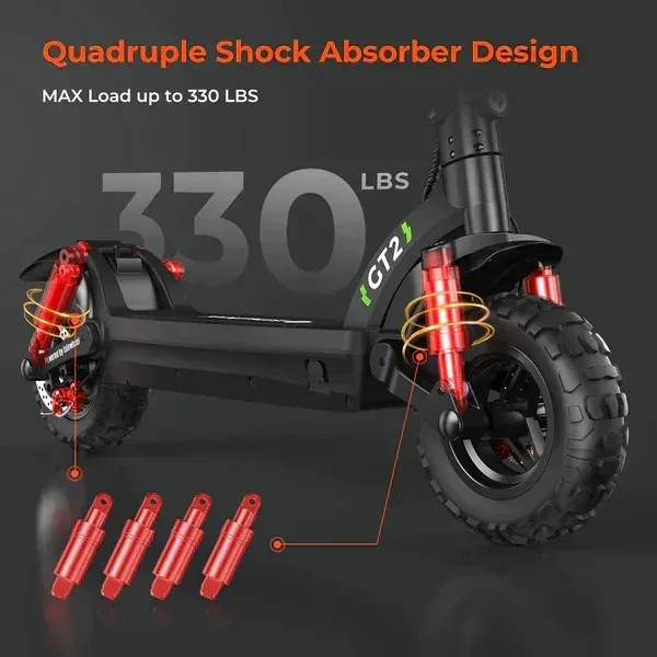 Designed with comfort in mind, the GT2 features 11-inch off-road pneumatic tyres that provide excellent shock absorption and stability. The scooter's foldable design makes it easy to store and transport.