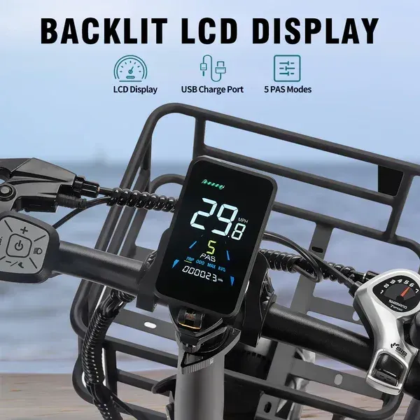 Stay informed with the LCD display that shows speed, battery level, and mileage. The bike also includes a horn and a USB port for charging your devices on the go. With a detachable saddle bag and front basket, you have ample storage for your essentials.