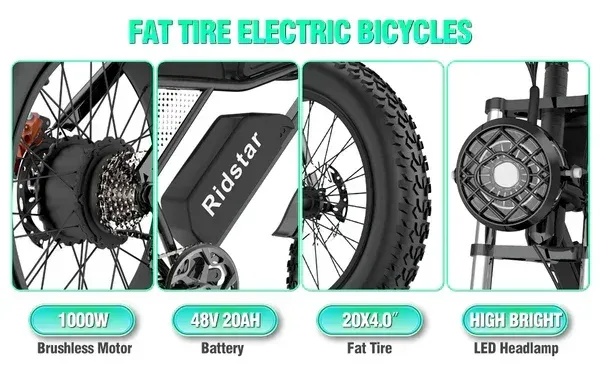 Experience the thrill of off-road biking with the Ridstar Q20, a powerful electric bike designed to tackle any terrain with ease. With its robust 1000W motor and durable fat tires, this bike is perfect for both city commutes and adventurous mountain trails.